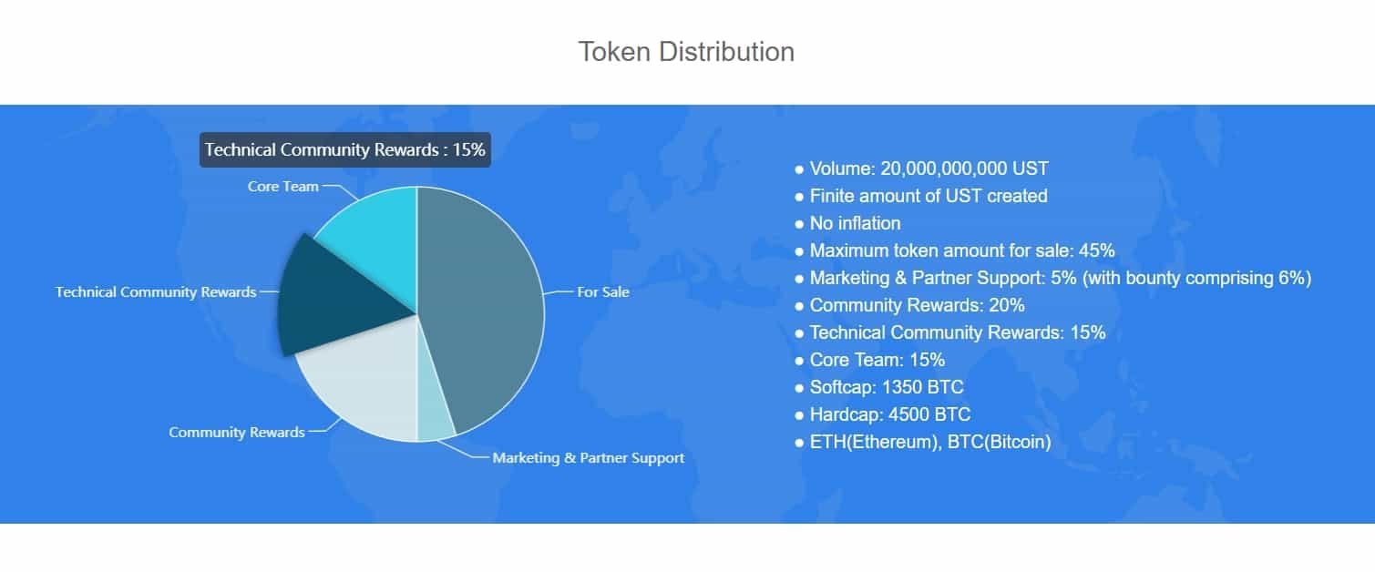 The platform’s official token referred to as UST is based on the ERC20 protocol on the Ethereum blockchain. Users can acquire the token during the initial Coin Offering. The main aim of creating the token is to give an opportunity for all participants to be involved in the building of the entire community. The token will also be used to reward the developers and supporters of the platform’s community as well as enabling the entire ecosystem to grow. UST will also allow every participant who hold tokens to use Dapp (Decentralized Application).